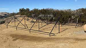| We use the SnapNRack 200 series extruded rail for all of our ground-mount racks. As an alternate method of supporting the 200 Series rail we build a custom support frame. The frames are built on steel pipe driven into the ground with a heavy duty pounder. | |