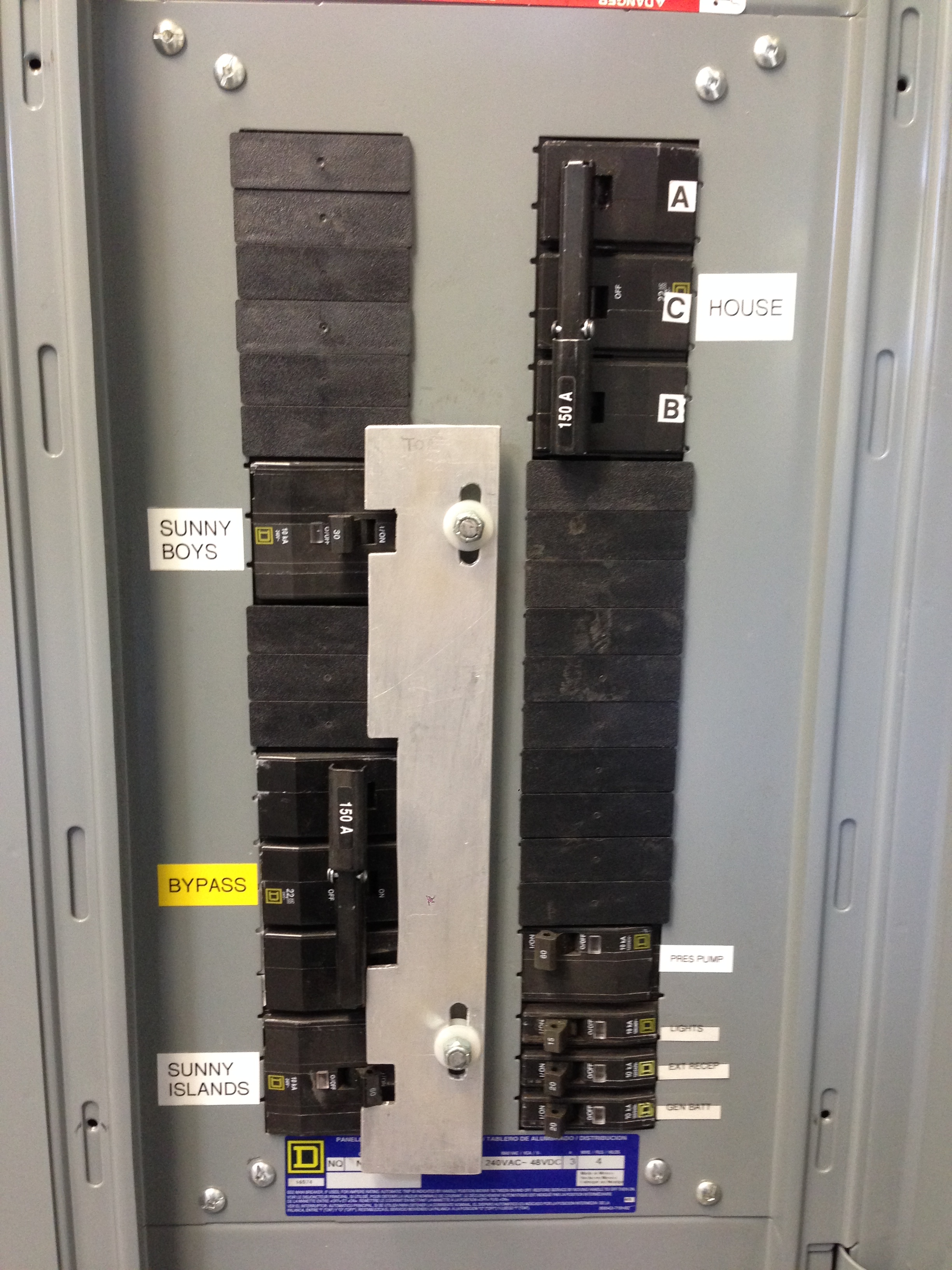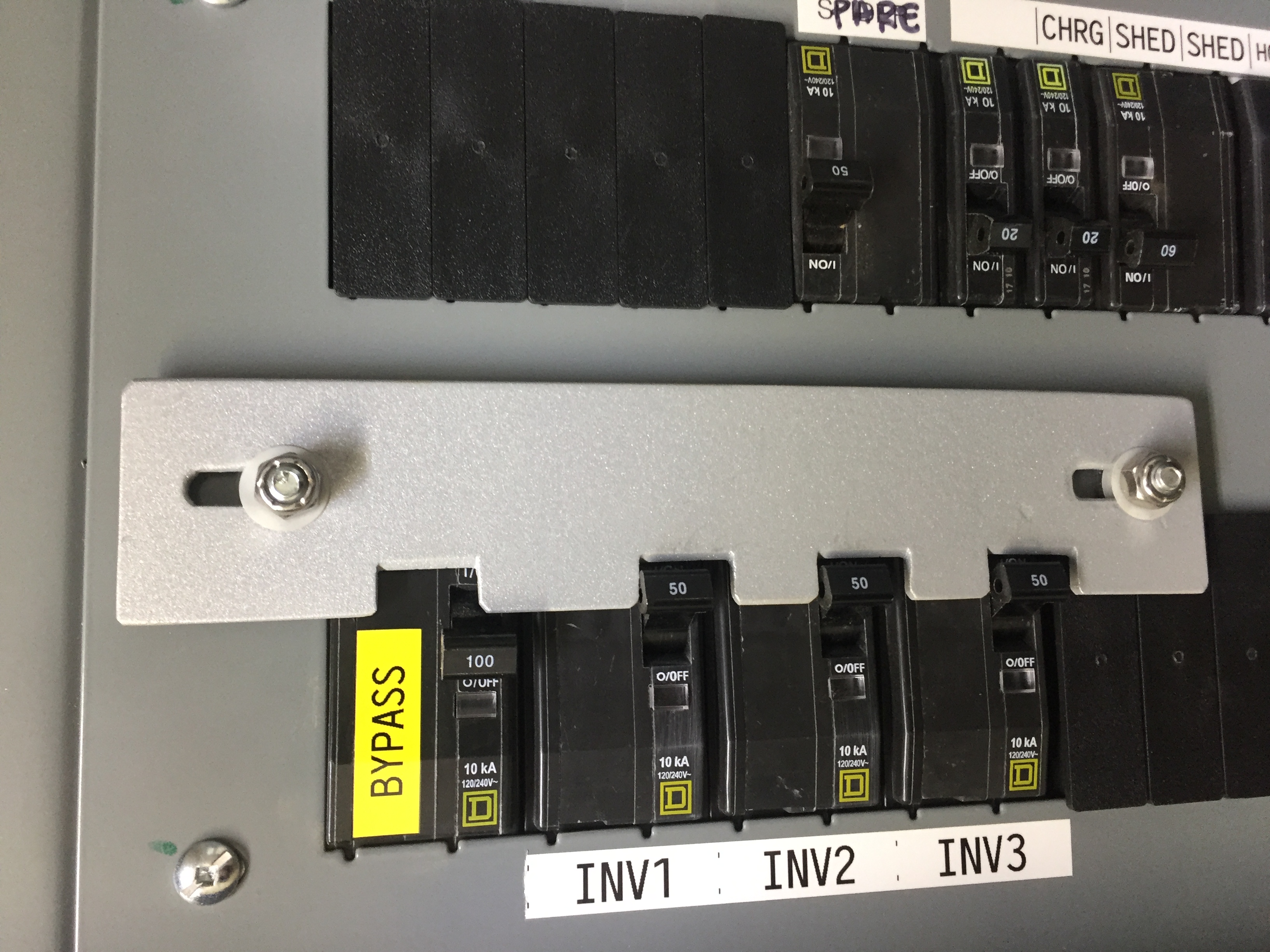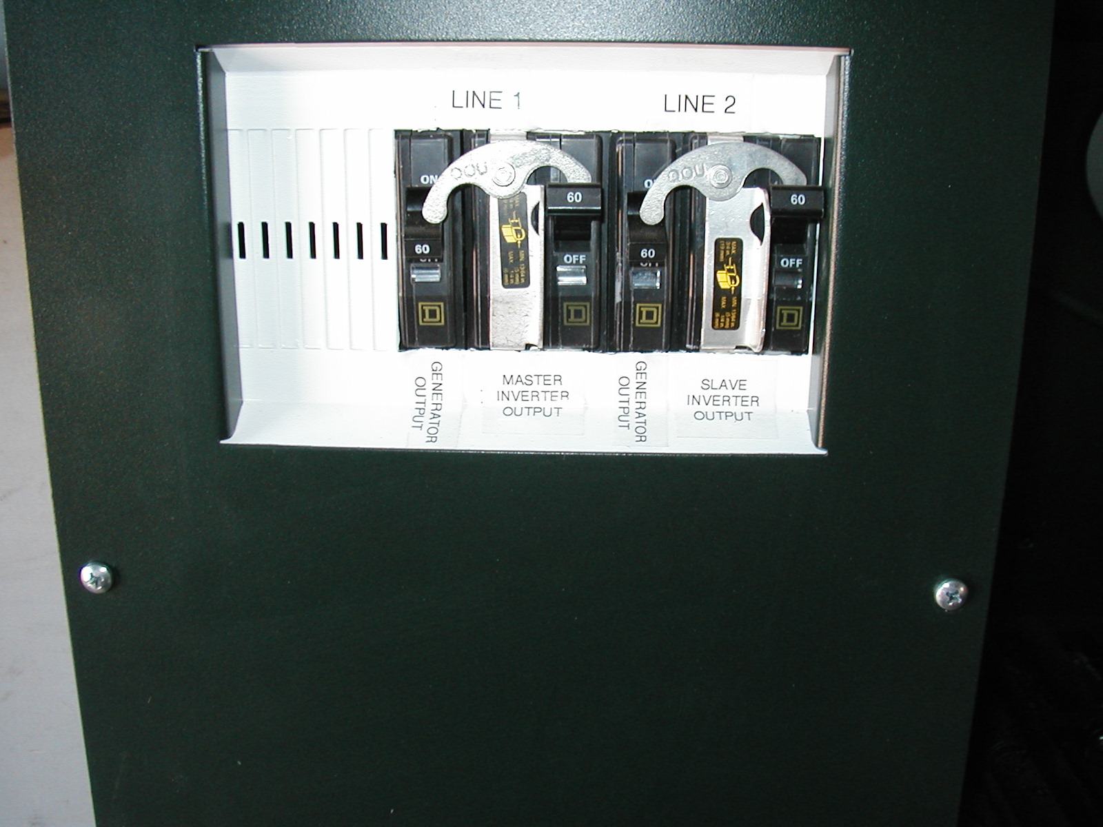 Later on slide plates became popular. These allowed one set of circuit breakers to be turned on only if the other set were turned off. This was accomplished by installing one set of breakers upside down. It allowed one, two or four inverters to be bypassed in favor of a generator or utility supply. |
