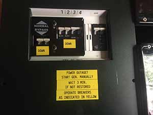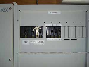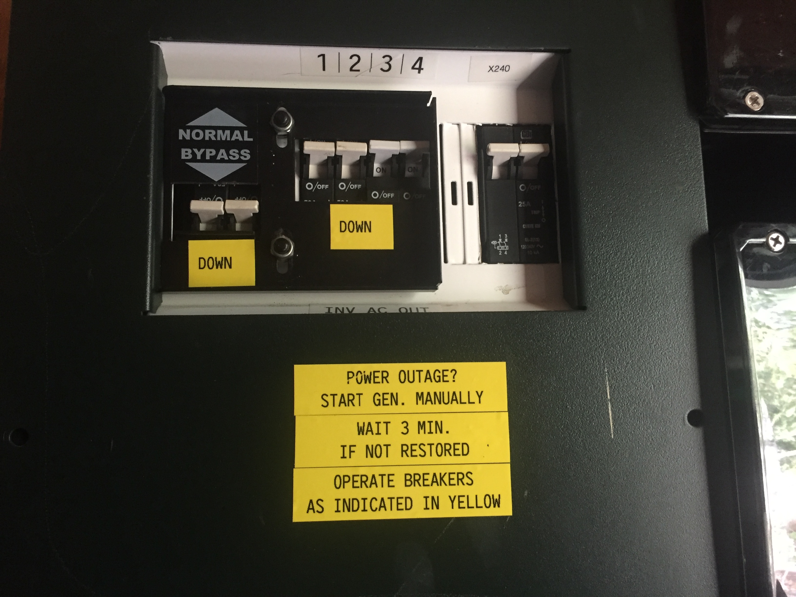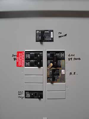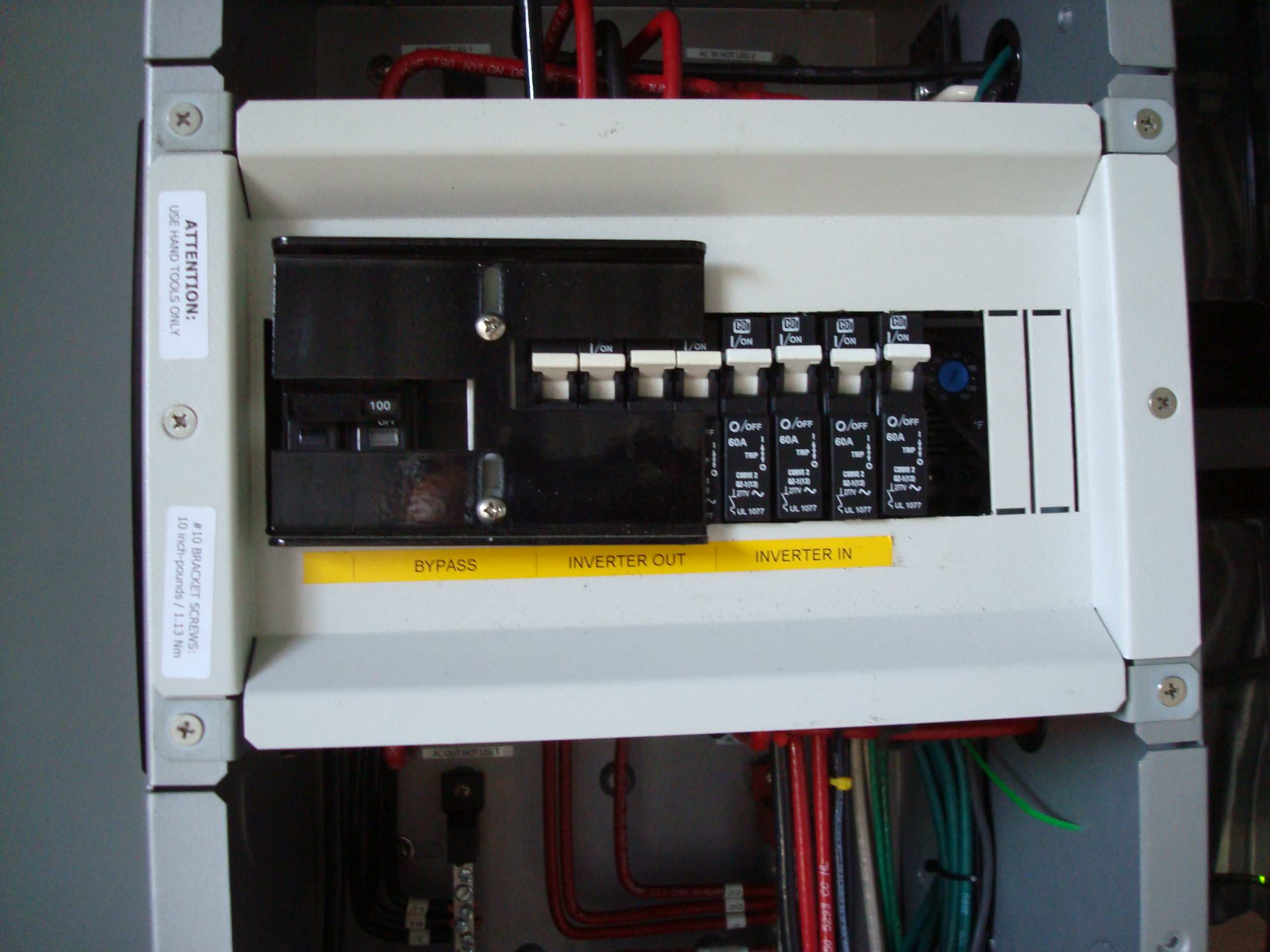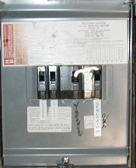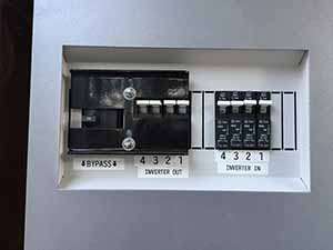 Later on slide plates became popular. These allowed one set of circuit breakers to be turned on only if the other set were turned off. This was accomplished by installing one set of breakers upside down. It allowed one, two or four inverters to be bypassed in favor of a generator or utility supply. |