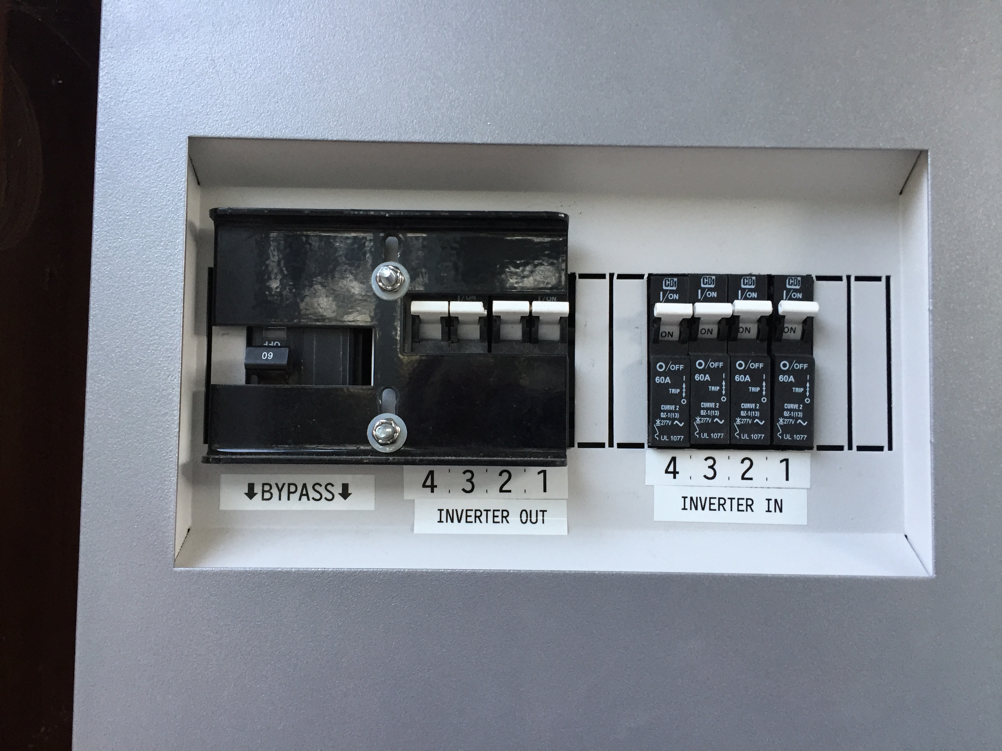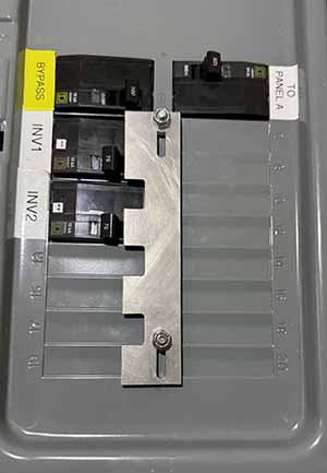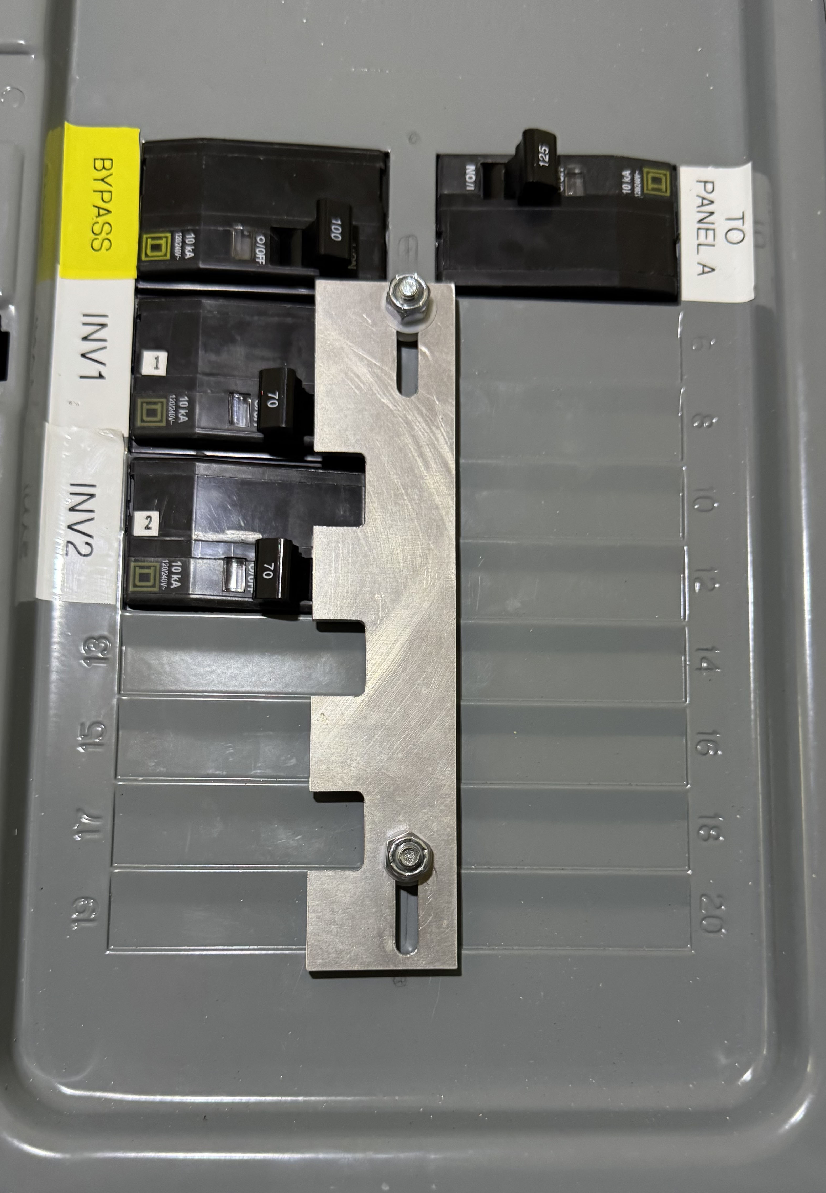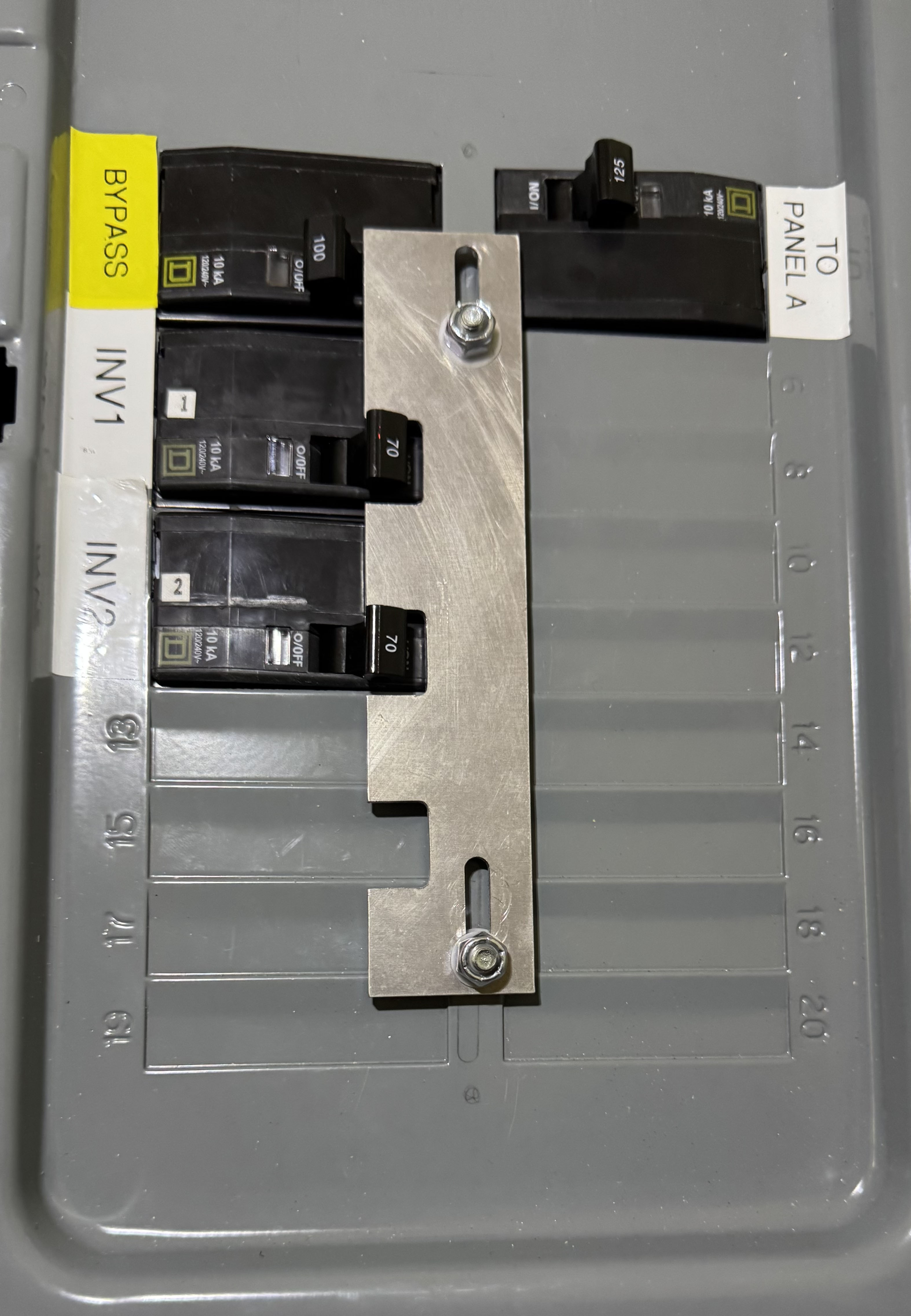 If you have no more than one inverter to bypass, the interlocks provided by a breaker panel manufacturer might be adequate, although they are not all well designed and some operate awkwardly. If, however, you have more than two inverters to bypass, none of the factory manufactured interlocks will work. |
