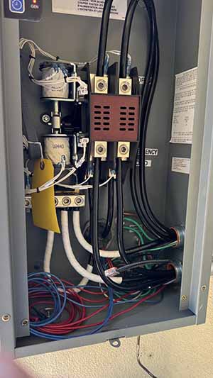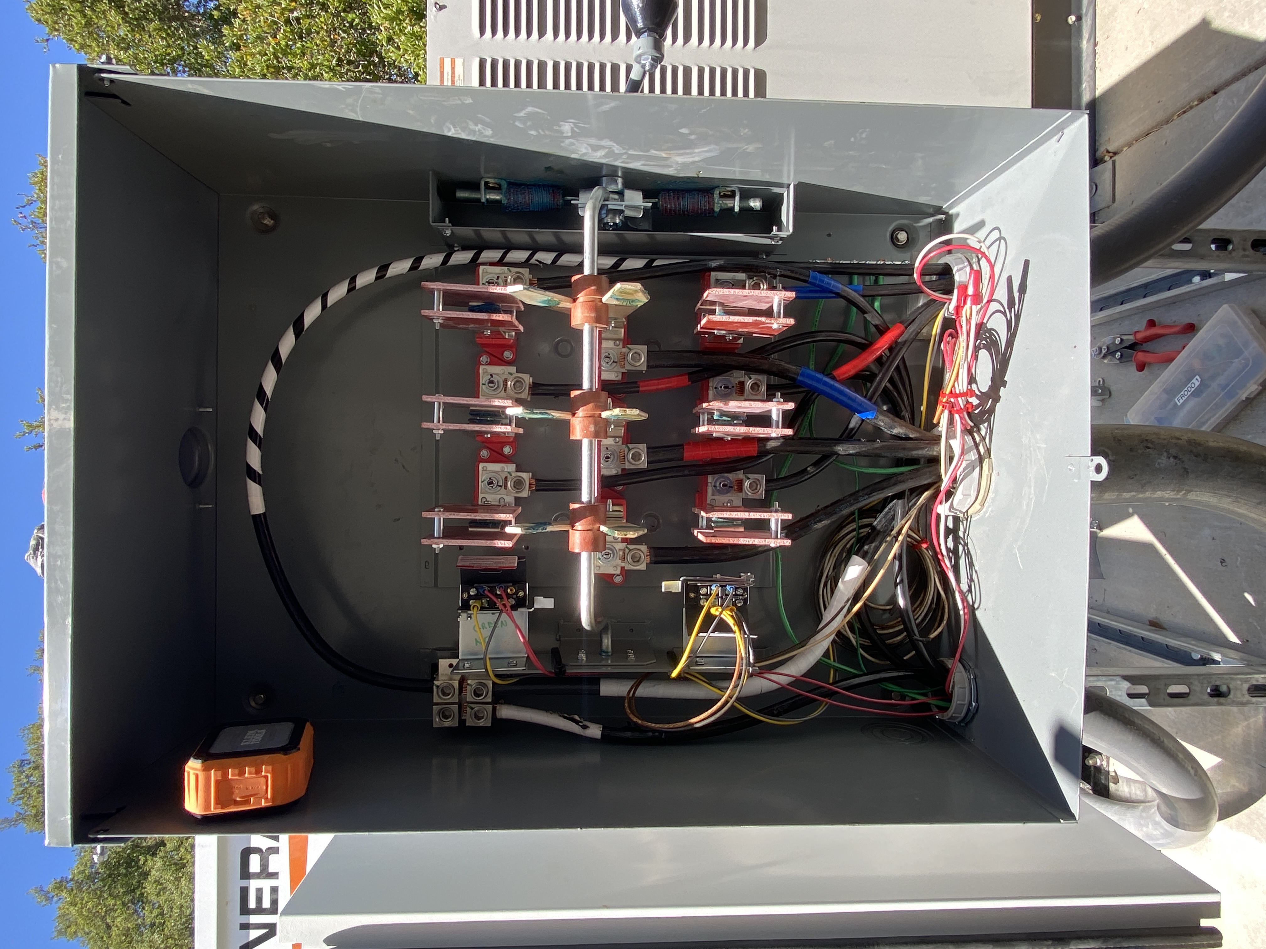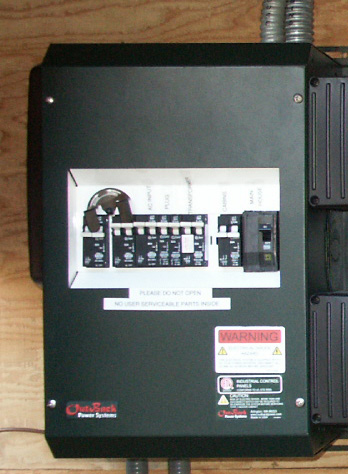 This XW system was more complicated: It had 3 inverters, a generator feed and a utility feed. The slide-plate will allow combining and sending three inverters to the loads, or the utility or the generator. |