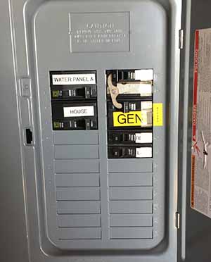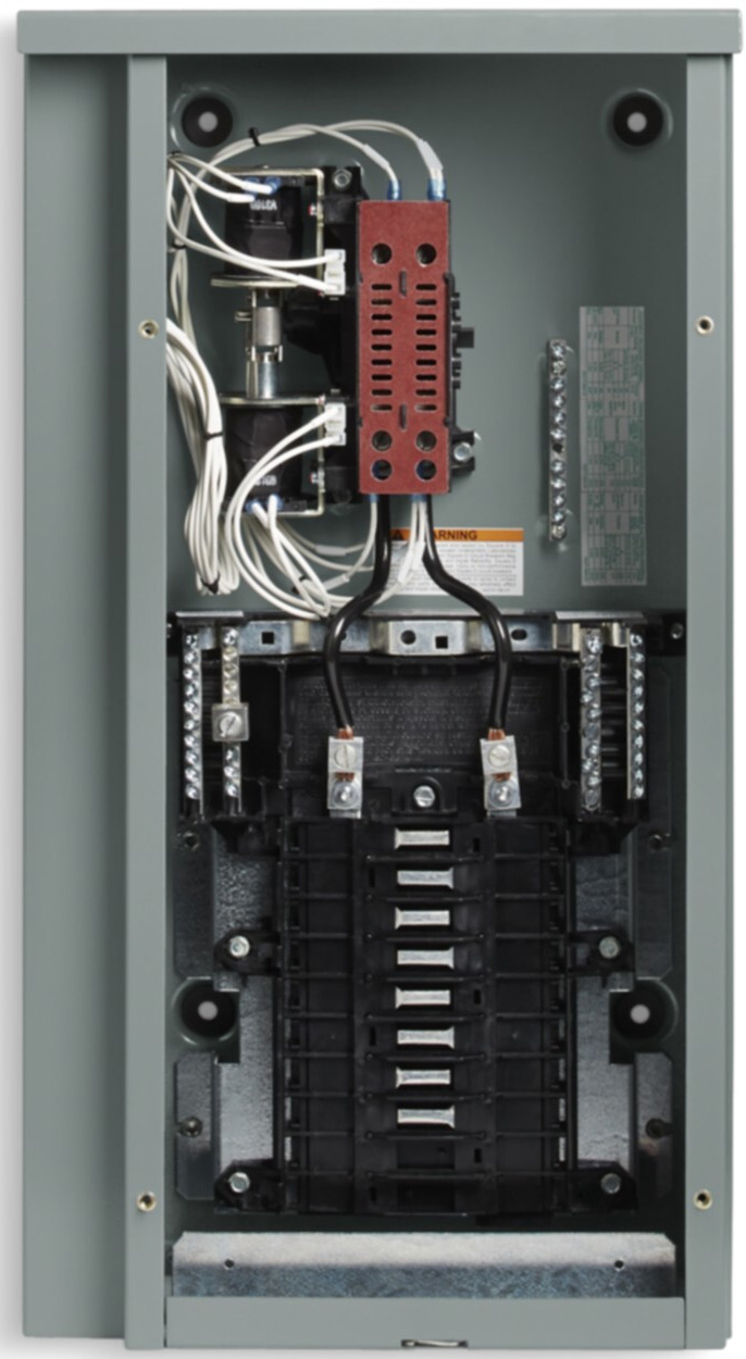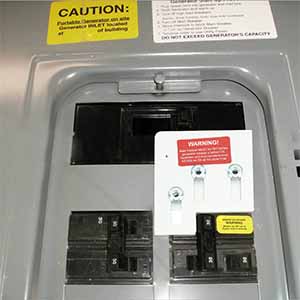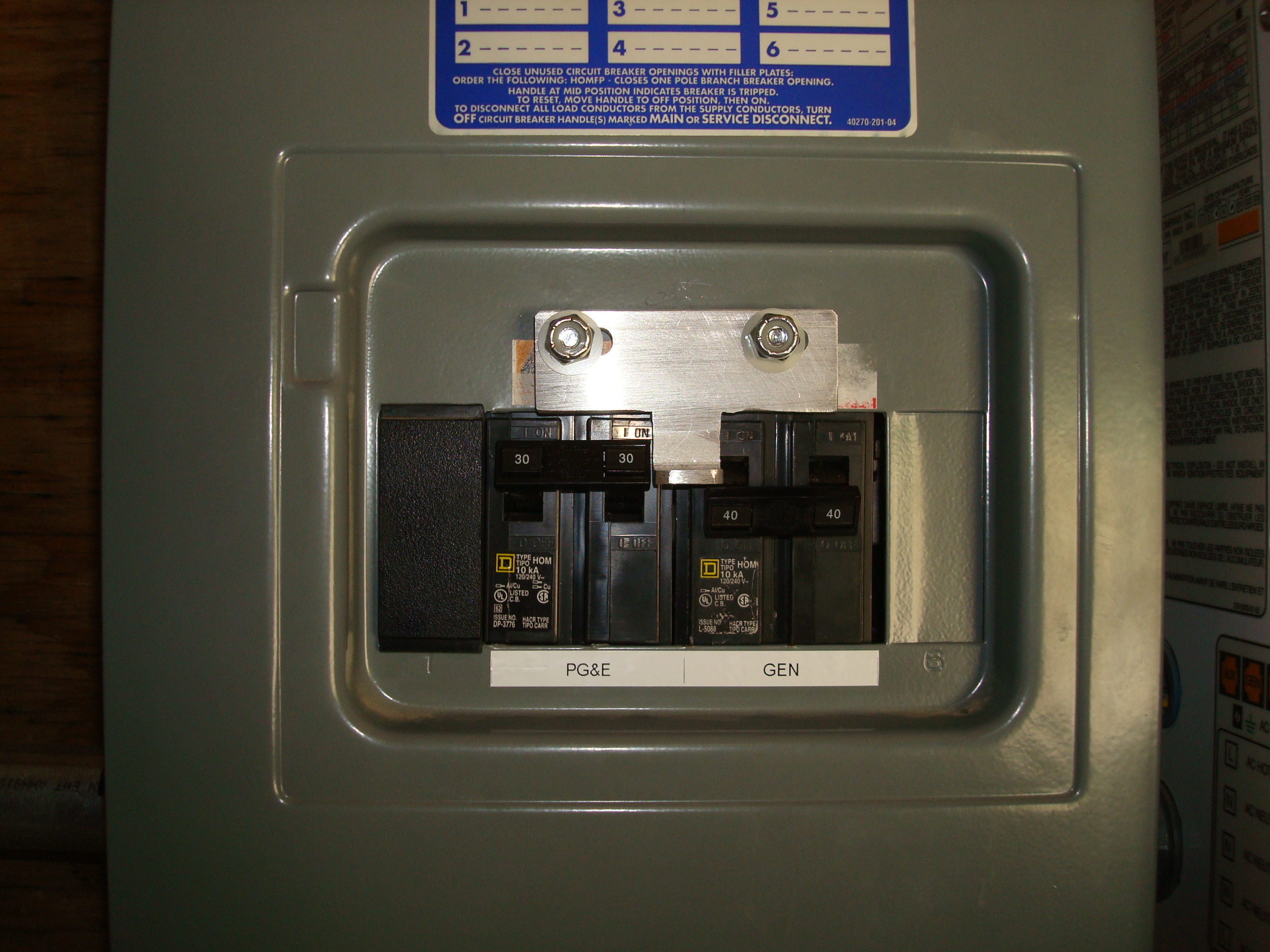 The transfer function can also be accomplished by use of circuit breakers that are outfitted with a mechanical means to allow one breaker to be turned on (backup power source) only if another breaker is turned off (main power source). This device is called an interlock. | |
