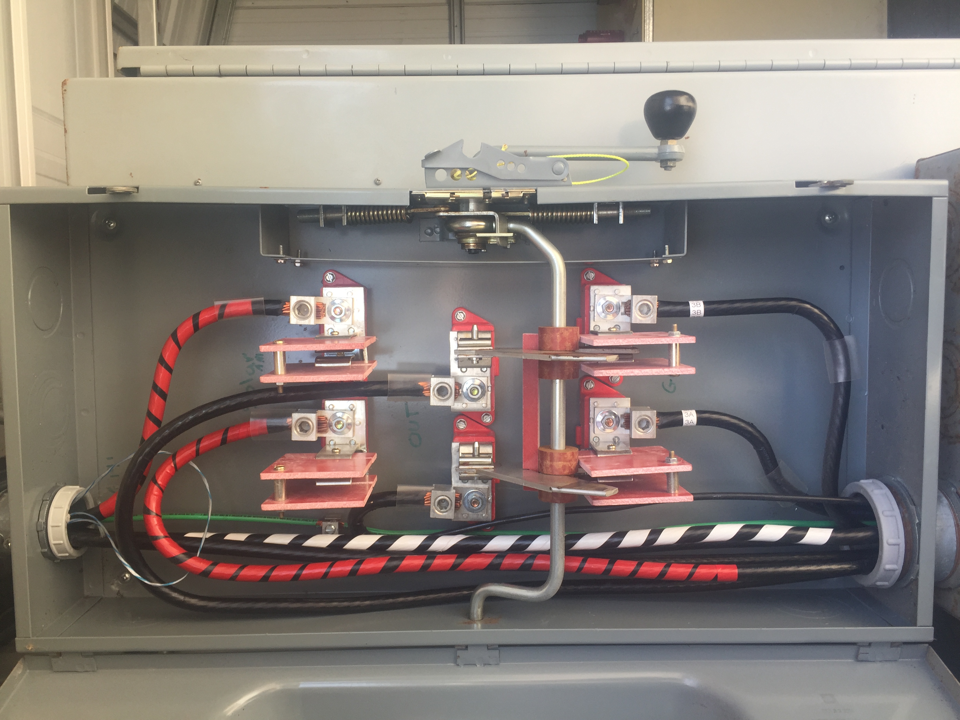 Manual transfer switches have a handle that is activated by hand and moves the wipers from connecting to one source or to the other. Below are pictures of manual transfer switches: | |