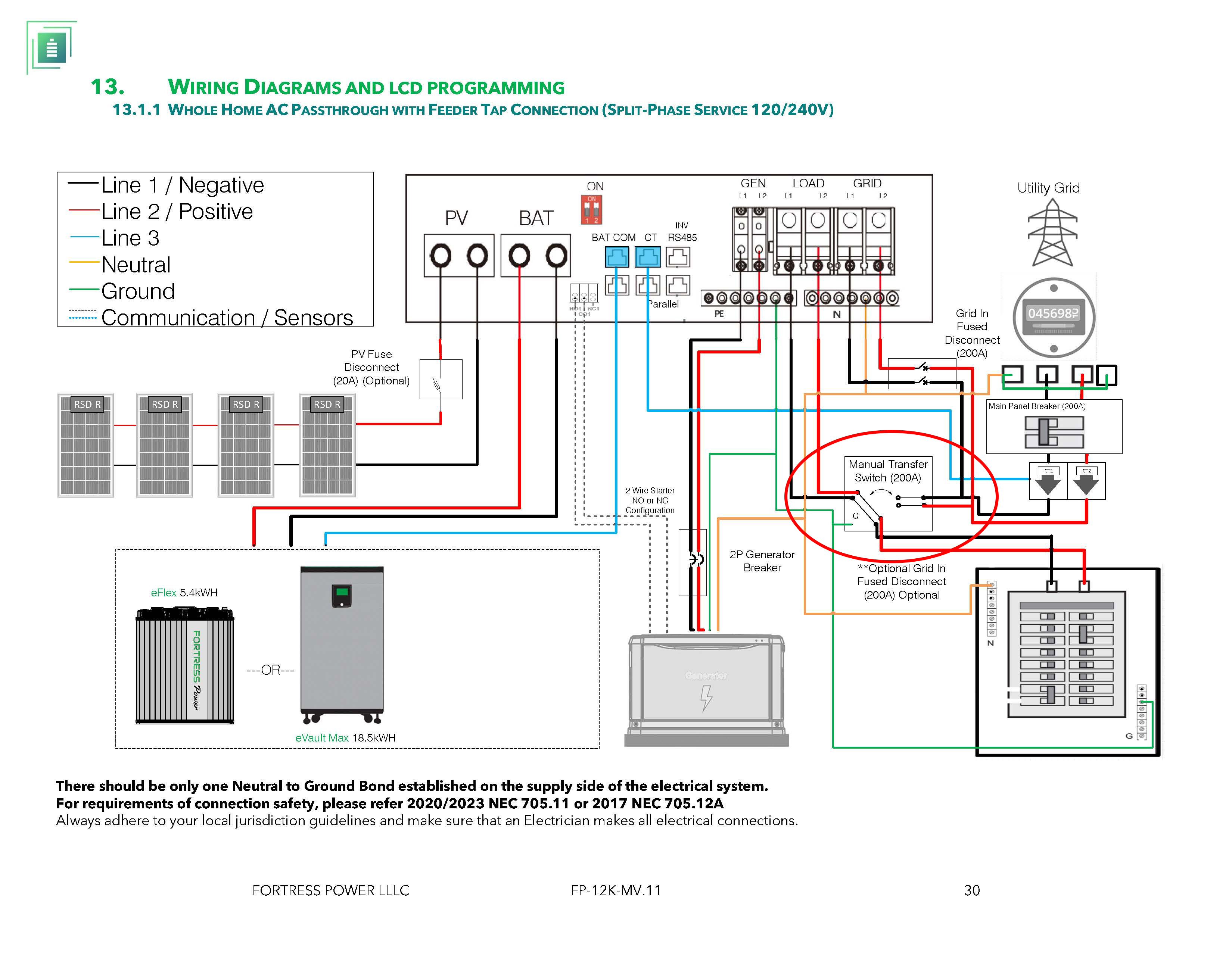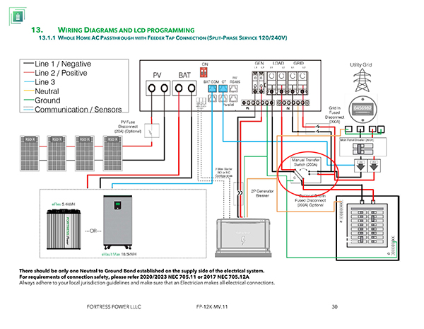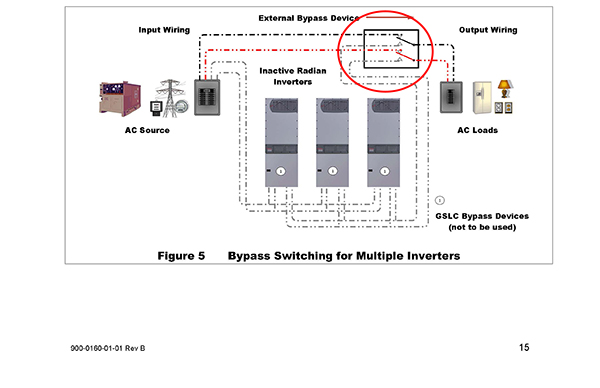 1. These inverters are designed for multiples of these units to be used in parallel if more capacity is needed. If the BOS bypassing cannot accommodate multiple inverters you are suggested to use an expensive outboard manual transfer switch, like the manual transfer switches we discussed above. Below is a wiring diagram from an inverter manufacturer suggesting this: |