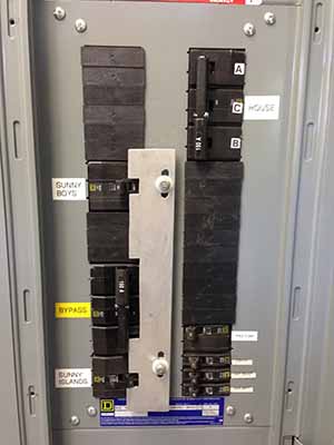 The bypass is interlocked with the outputs of 3 Sunny Boys combined in a separate panel and 4 Sunny Islands combined in another separate panel. |