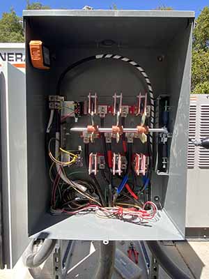 Three pole transfer switch with auxiliary contacts. The aux contacts open and close as the handle is moved and allow a generator start signal to be directed to the generator currently connected. |